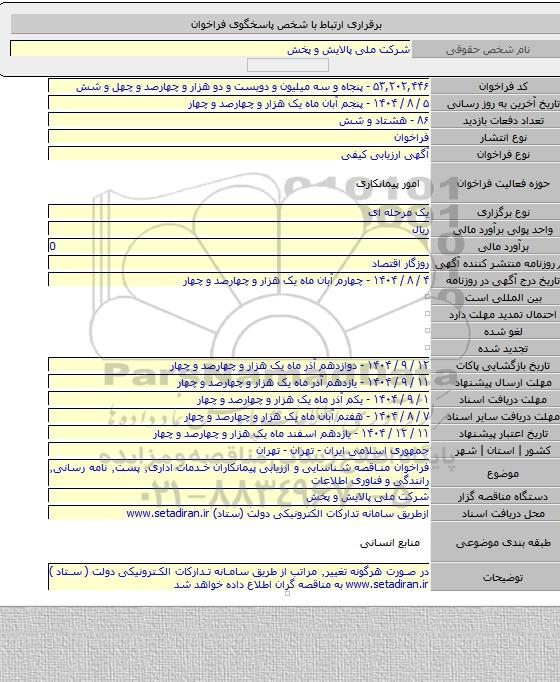 تلفن:5- 88349670 (021) فکس: 88349673 (021) Website: www.ParsNamadData.com E-mail: Info@ParsNamadData.com مناقصه فراخوان مناقصه شناسایی و ارزیابی پیمانکاران خدمات اداری٬ پست٬ نامه رسانی٬ رانندگی و فناوری اطلاعات