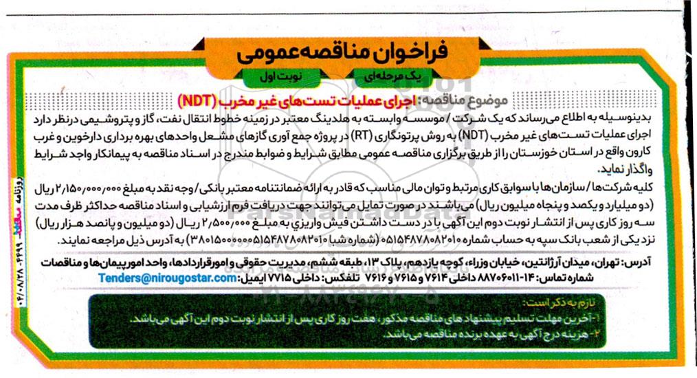 بدینوسیله به اطلاع میرساند که یک شرکت / موسسه وابسته به هلدینگ معتبر در زمینه خطوط انتقال نفت، گاز و پتروشیمی در نظر دارد اجرای عملیات تست های غیر مخرب (NDT) به روش پرتونگاری (RT) در پروژه جمع آوری گازهای مشعل واحدهای بهره برداری دارخوین و عرب کارون واقع در استان خوزستان را از طریق برگزاری مناقصه عمومی مطابق شرایط و ضوابط مندرج در اسناد مناقصه به پیمانکار واجد شرایط واگذار نماید.
