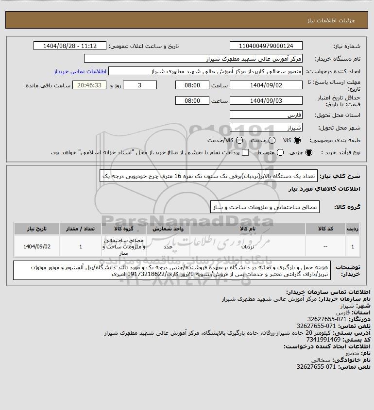 تلفن:5- 88349670 (021) فکس: 88349673 (021) Website: www.ParsNamadData.com E-mail: Info@ParsNamadData.com استعلام تعداد یک دستگاه بالابر(نردبان)برقی تک ستون تک نفره 16 متری چرخ خودرویی درجه یک