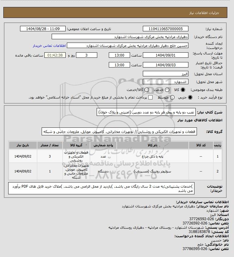 1 -- پایه یا دکل چراغ عدد قطعات و تجهیزات الکتریکی و روشنایی 3 1404/09/02