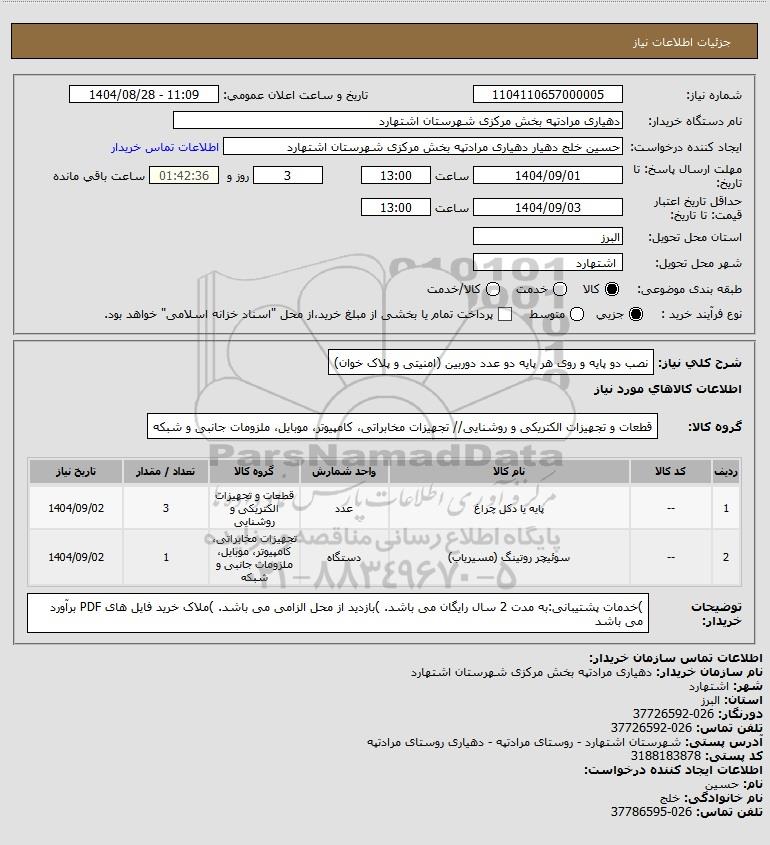 تلفن:5- 88349670 (021) فکس: 88349673 (021) Website: www.ParsNamadData.com E-mail: Info@ParsNamadData.com استعلام نصب دو پایه و روی هر پایه دو عدد دوربین (امنیتی و پلاک خوان)