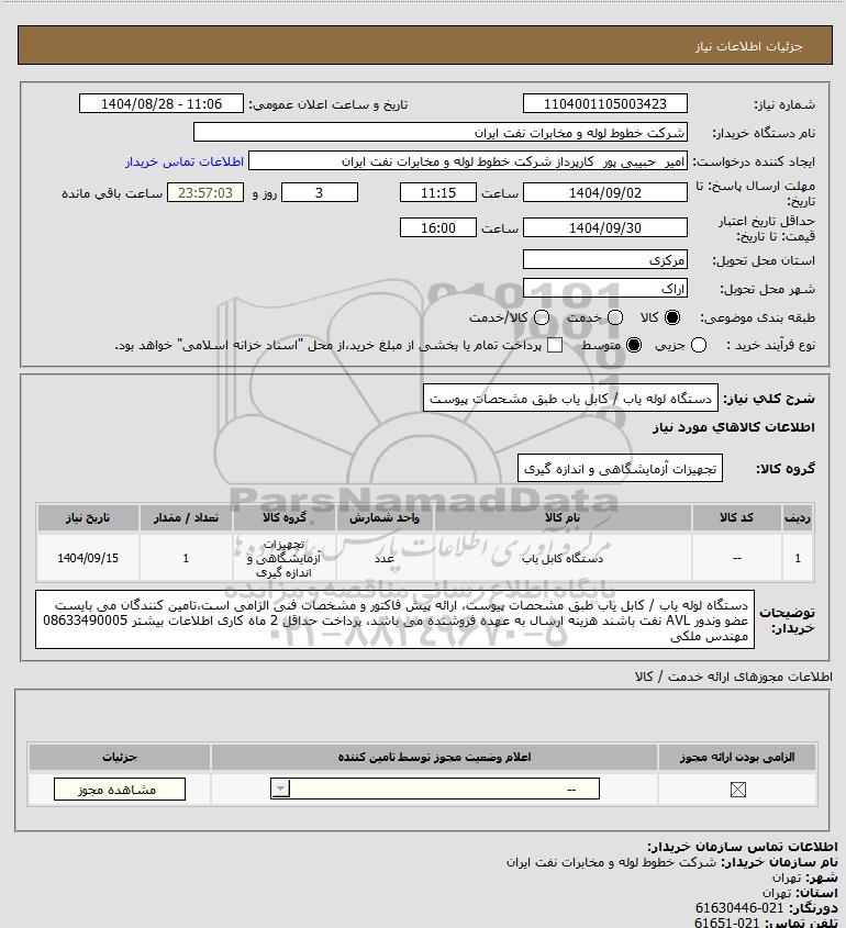 تلفن:5- 88349670 (021) فکس: 88349673 (021) Website: www.ParsNamadData.com E-mail: Info@ParsNamadData.com استعلام دستگاه لوله یاب / کابل یاب طبق مشحصات پیوست