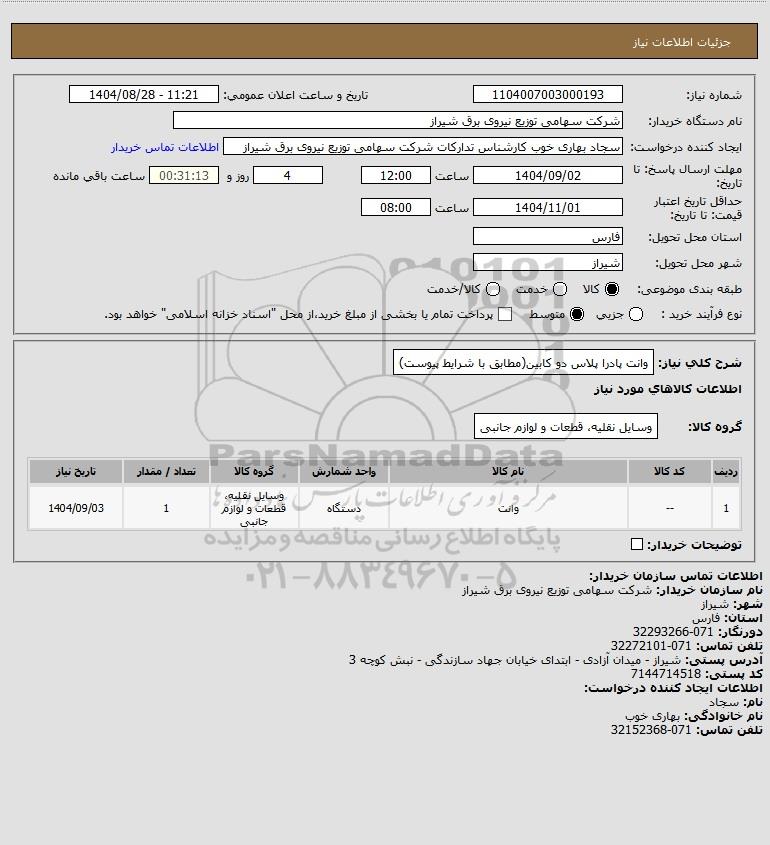 تلفن:5- 88349670 (021) فکس: 88349673 (021) Website: www.ParsNamadData.com E-mail: Info@ParsNamadData.com استعلام وانت پادرا پلاس دو کابین(مطابق با شرایط پیوست)