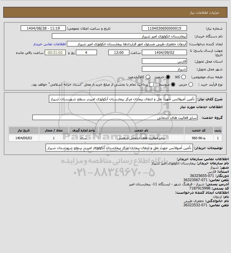تلفن:5- 88349670 (021) فکس: 88349673 (021) Website: www.ParsNamadData.com E-mail: Info@ParsNamadData.com استعلام تأمین آمبولانس جهت نقل و انتقال بیماران مرکز بیمارستان آنکولوژی امیردر سطح شهرستان شیراز
