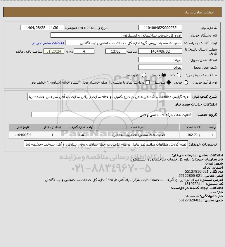 تلفن:5- 88349670 (021) فکس: 88349673 (021) Website: www.ParsNamadData.com E-mail: Info@ParsNamadData.com استعلام تهیه گزارش مطالعات پدافند غیر عامل در طرح تکمیل دو خطه سازی و برقی سازی راه آهن سرخس-چشمه ثریا