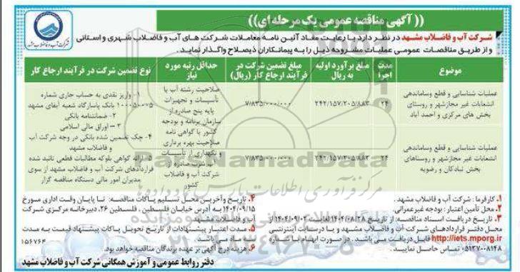 شرکت آب و فاضلاب مشهد در نظر دارد با رعایت مفاد آیین نامه معاملات شرکت های آب و فاضلاب شهری و استانی و از طریق مناقصه عمومی عملیات مشروحه ذیل را از پیمانکاران ذیصلاح واگذار نماید.