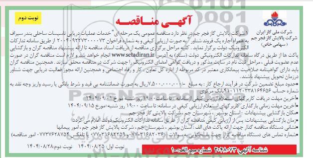 شرکت پالایش گاز فجر جم در نظر دارد مناقصه عمومی یک مرحله ای " خدمات عملیات دریایی تاسیسات ساحلی بندر سیراف به همراه اجاره یک فروند شناور " بصورت ارزیابی کیفی و به شماره فراخوان 2004092273000073 از طریق سامانه تدارکات الکترونیک دولت برگزار نماید. کلیه مراحل برگزاری مناقصه از دریافت اسناد مناقصه تا ارائه پیشنهاد مناقصه گران و بازگشایی پاکتها از طریق درگاه سامانه تدارکات الکترونیکی دولت (ستاد) به آدرس سایت ستاد ایران انجام خواهد شد و لازم است مناقصه گران در صورت عدم عضویت قبلی ، مراحل ثبت نام در سایت مذکور و دریافت گواهی امضای الکترونیک را جهت شرکت در مناقصه محقق سازند. همچنین مناقصه گران باید دارای گواهینامه صلاحیت پیمانکاری معتبر در کد مربوطه از اداره کل تعاون، کار و رفاه اجتماعی و همچنین ارائه مجوز فعالیت دریایی جهت شناور در زمان تحویل پیشنهاد باشند .