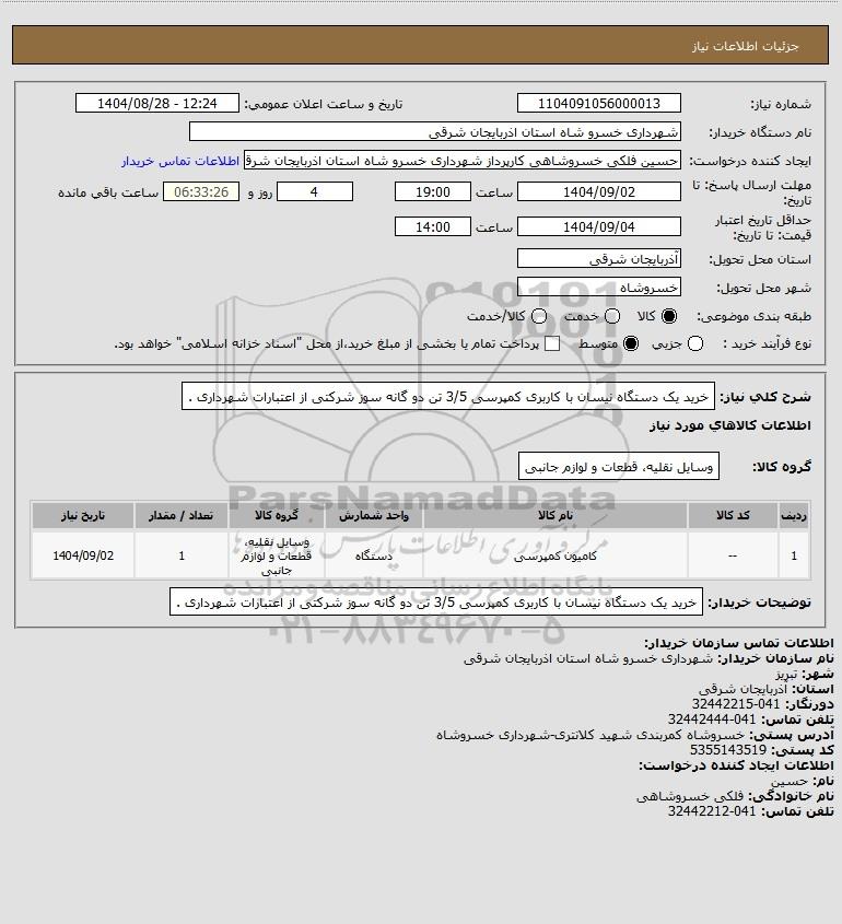 تلفن:5- 88349670 (021) فکس: 88349673 (021) Website: www.ParsNamadData.com E-mail: Info@ParsNamadData.com استعلام خرید یک دستگاه نیسان با کاربری کمپرسی 3/5 تن دو گانه سوز شرکتی از اعتبارات شهرداری .