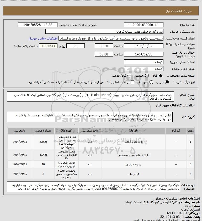 تلفن:5- 88349670 (021) فکس: 88349673 (021) Website: www.ParsNamadData.com E-mail: Info@ParsNamadData.com استعلام کارت خام - هولوگرام امنیتی طرح خاص - ریبون (Color Ribbon) - فیلم ( پیوست دارد)