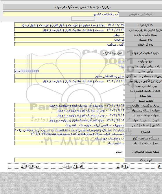 تلفن:5- 88349670 (021) فکس: 88349673 (021) Website: www.ParsNamadData.com E-mail: Info@ParsNamadData.com مناقصه عملیات اصلاح و ترمبم نقاط پراکنده خط انتقال آب شرب از سه راهی بزی تا تاسیسات جنوب شرق وسایرنقاط پراکنده شهرزهره هندیجان۱۴۰۴/۱۰۶۳