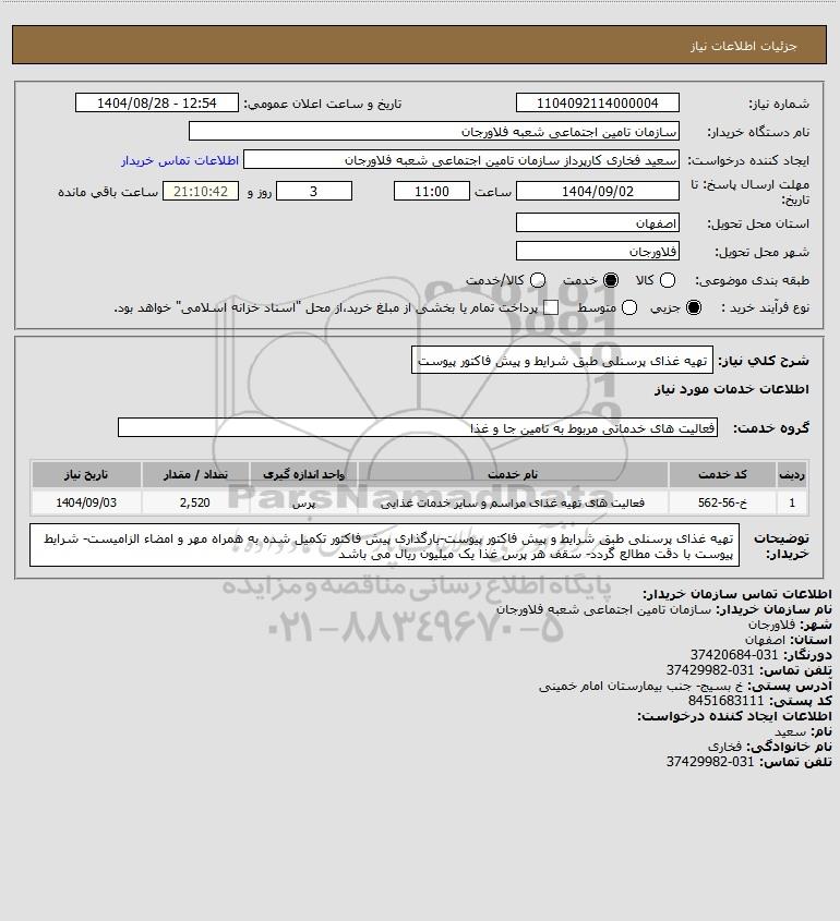 تلفن:5- 88349670 (021) فکس: 88349673 (021) Website: www.ParsNamadData.com E-mail: Info@ParsNamadData.com استعلام تهیه غذای پرسنلی طبق شرایط و پیش فاکتور پیوست