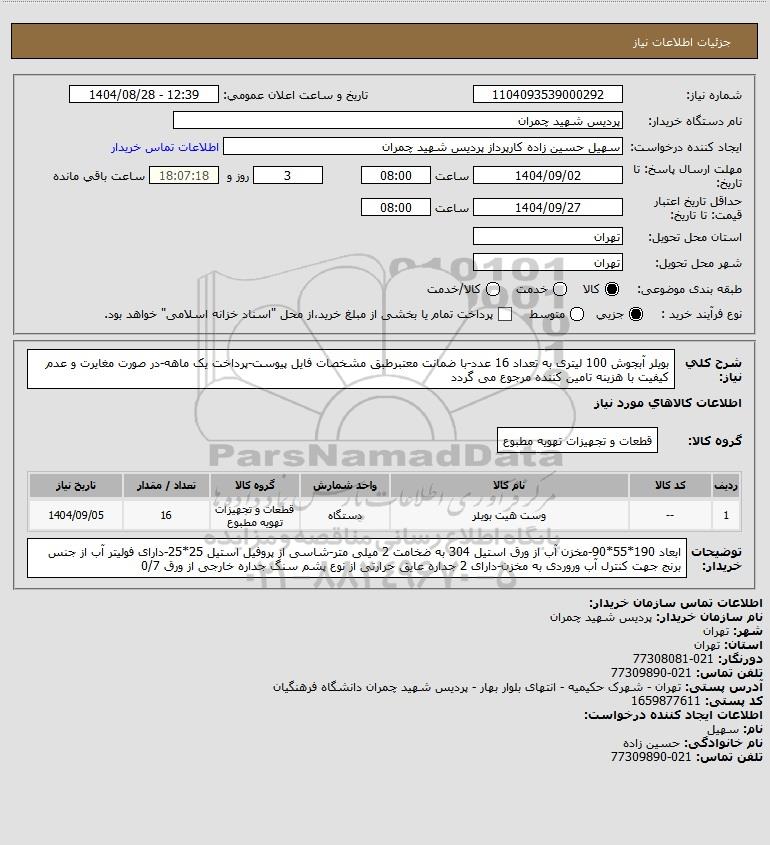 تلفن:5- 88349670 (021) فکس: 88349673 (021) Website: www.ParsNamadData.com E-mail: Info@ParsNamadData.com استعلام بویلر آبجوش 100 لیتری به تعداد 16 عدد-با ضمانت معتبرطبق مشخصات فایل پیوست-پرداخت یک ماهه-در صورت مغایرت و عدم کیفیت با هزینه تامین کننده مرجوع می گردد
