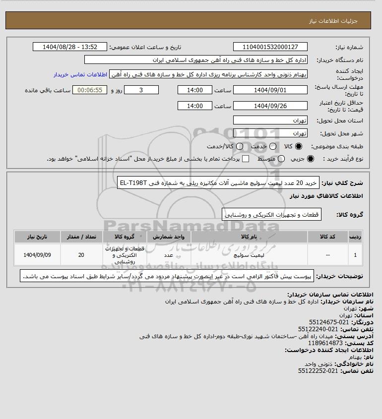 تلفن:5- 88349670 (021) فکس: 88349673 (021) Website: www.ParsNamadData.com E-mail: Info@ParsNamadData.com استعلام خرید 20 عدد لیمیت سوئیچ ماشین آلات مکانیزه ریلی به شماره فنی EL-T198T