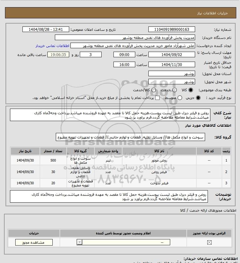 تلفن:5- 88349670 (021) فکس: 88349673 (021) Website: www.ParsNamadData.com E-mail: Info@ParsNamadData.com استعلام روغن و فیلتر دیزل طبق لیست پیوستهزینه حمل کالا تا مقصد به عهده فروشنده میباشدپرداخت وجه3ماه کاری میباشدشرایط معامله ملاحضه گرددفرم براورد پر شود