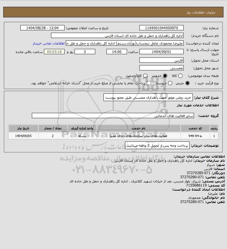 تلفن:5- 88349670 (021) فکس: 88349673 (021) Website: www.ParsNamadData.com E-mail: Info@ParsNamadData.com استعلام خرید روغن موتور جهت راهداری ممسنی طبق مجوز پیوست