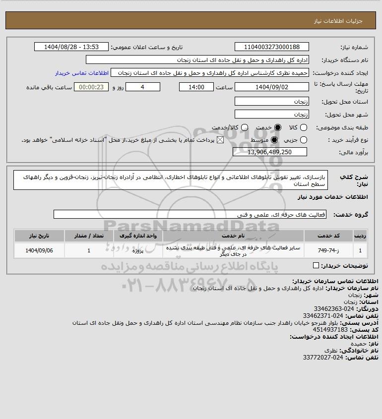 تلفن:5- 88349670 (021) فکس: 88349673 (021) Website: www.ParsNamadData.com E-mail: Info@ParsNamadData.com استعلام بازسازی تغییر نقوش تابلوهای اطلاعاتی و انواع تابلوهای اخطاری انتظامی در آزادراه زنجان-تبریز زنجان-قزوین و دیگر راههای سطح استان