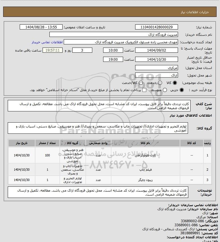 تلفن:5- 88349670 (021) فکس: 88349673 (021) Website: www.ParsNamadData.com E-mail: Info@ParsNamadData.com استعلام کارت ترددی دقیقاً برابر فایل پیوست. ایران کد مشابه است. محل تحویل فرودگاه اراک می باشد. مطالعه تکمیل و ارسال فرمهای ضمیمه الزامی است.