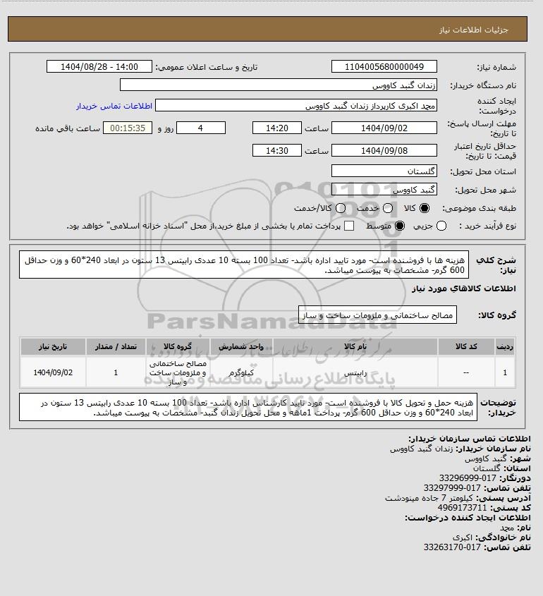 تلفن:5- 88349670 (021) فکس: 88349673 (021) Website: www.ParsNamadData.com E-mail: Info@ParsNamadData.com استعلام هزینه ها با فروشنده است- مورد تایید اداره باشد- تعداد 100 بسته 10 عددی رابیتس 13 ستون در ابعاد 240*60 و وزن حداقل 600 گرم- مشخصات به پیوست میباشد.