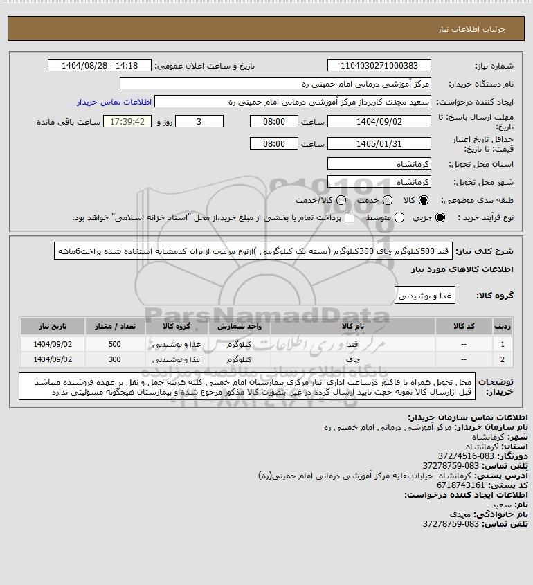 تلفن:5- 88349670 (021) فکس: 88349673 (021) Website: www.ParsNamadData.com E-mail: Info@ParsNamadData.com استعلام قند 500کیلوگرم چای 300کیلوگرم (بسته یک کیلوگرمی )ازنوع مرغوب ازایران کدمشابه استفاده شده پراخت6ماهه