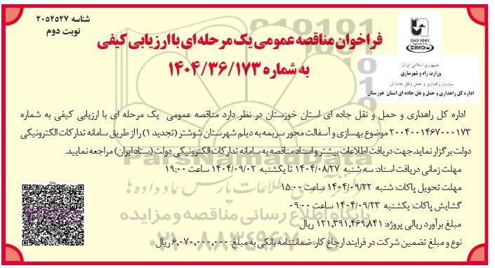 تلفن:5- 88349670 (021) فکس: 88349673 (021) Website: www.ParsNamadData.com E-mail: Info@ParsNamadData.com تجدید 1 مناقصه بهسازی و آسفالت محور- نوبت دوم