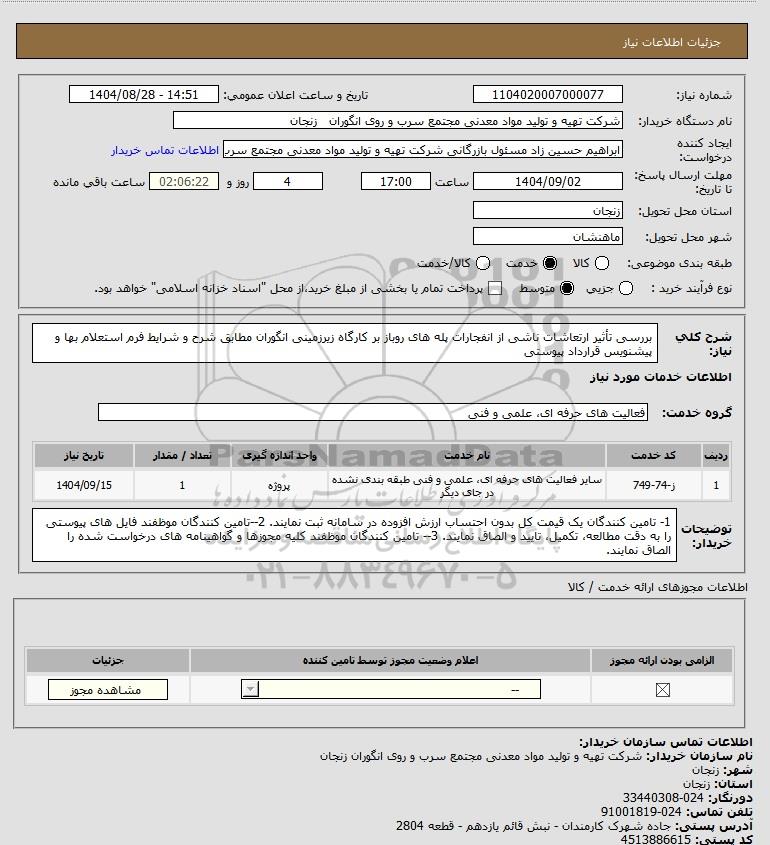 تلفن:5- 88349670 (021) فکس: 88349673 (021) Website: www.ParsNamadData.com E-mail: Info@ParsNamadData.com استعلام بررسی تأثیر ارتعاشات ناشی از انفجارات پله های روباز بر کارگاه زیرزمینی انگوران مطابق شرح و شرایط فرم استعلام بها و پیشنویس قرارداد پیوستی
