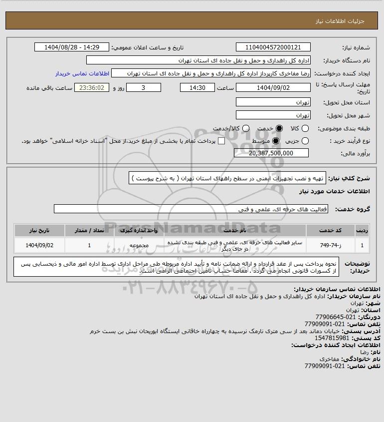 تلفن:5- 88349670 (021) فکس: 88349673 (021) Website: www.ParsNamadData.com E-mail: Info@ParsNamadData.com استعلام تهیه و نصب تجهیزات ایمنی در سطح راههای استان تهران ( به شرح پیوست )
