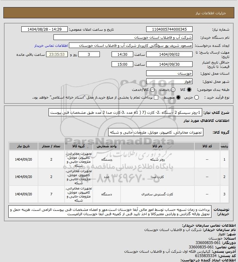 تلفن:5- 88349670 (021) فکس: 88349673 (021) Website: www.ParsNamadData.com E-mail: Info@ParsNamadData.com استعلام 1-روتر سیسکو 2 دستگاه 2- کارت (e1 ) 7 عدد 3-کارت صدا 2 عدد طبق مشخصات فنی پیوست