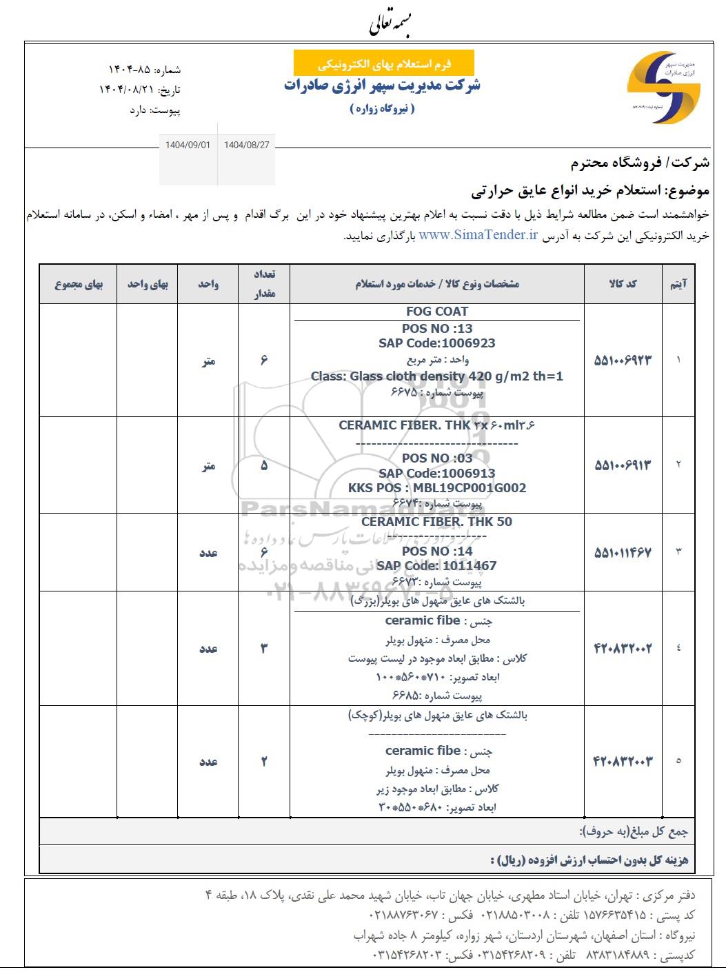 | عنوان آگهی: استعلام خرید انواع عایق حرارتی |