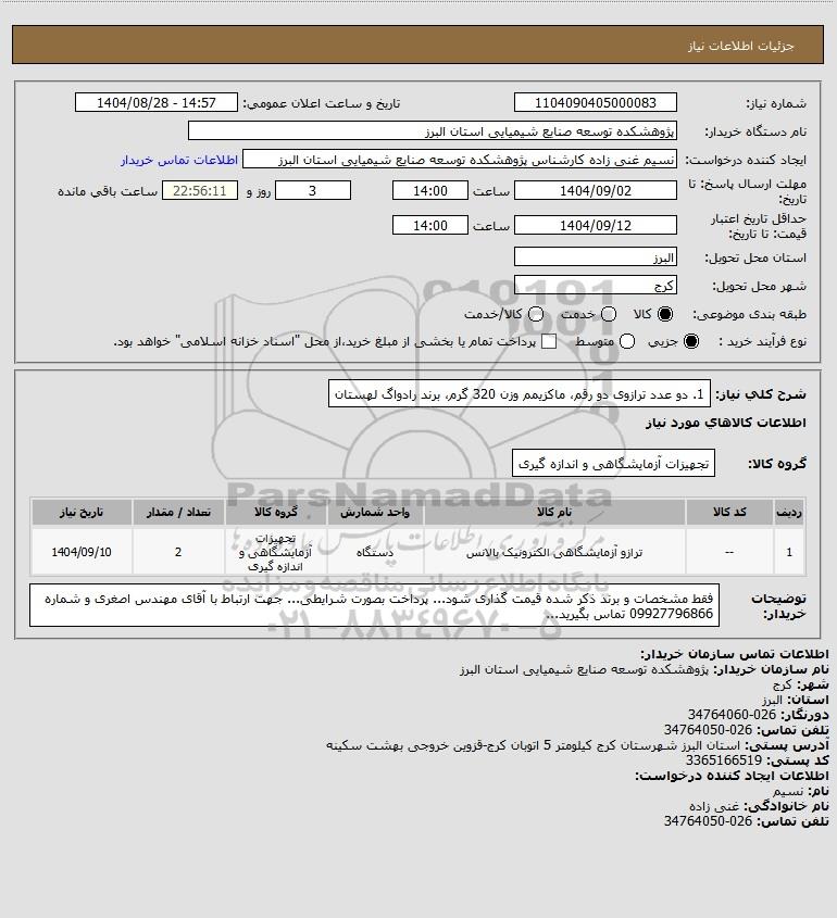 تلفن:5- 88349670 (021) فکس: 88349673 (021) Website: www.ParsNamadData.com E-mail: Info@ParsNamadData.com استعلام 1. دو عدد ترازوی دو رقم ماکزیمم وزن 320 گرم برند رادواگ لهستان