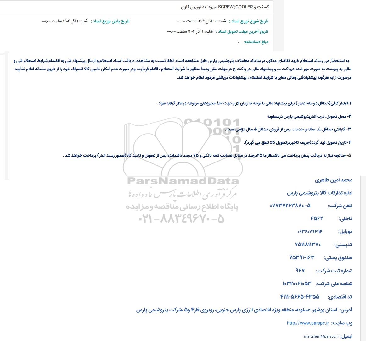 | عنوان آگهی: استعلام گسکت و COOLER و SCREW مربوط به توربین گازی |