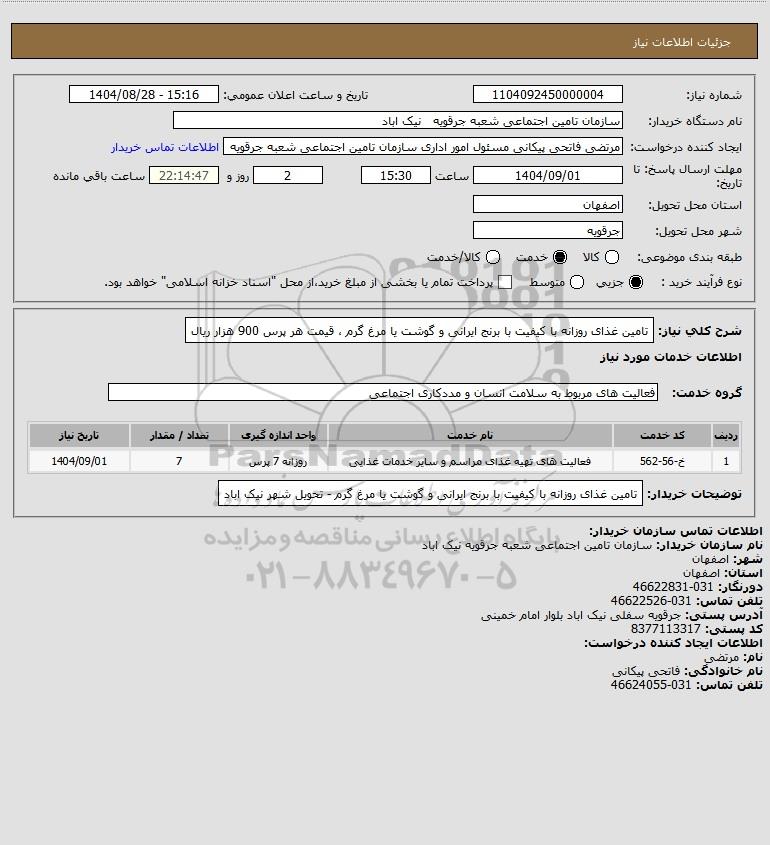 تلفن:5- 88349670 (021) فکس: 88349673 (021) Website: www.ParsNamadData.com E-mail: Info@ParsNamadData.com استعلام تامین غذای روزانه با کیفیت با برنج ایرانی و گوشت یا مرغ گرم قیمت هر پرس 900 هزار ریال