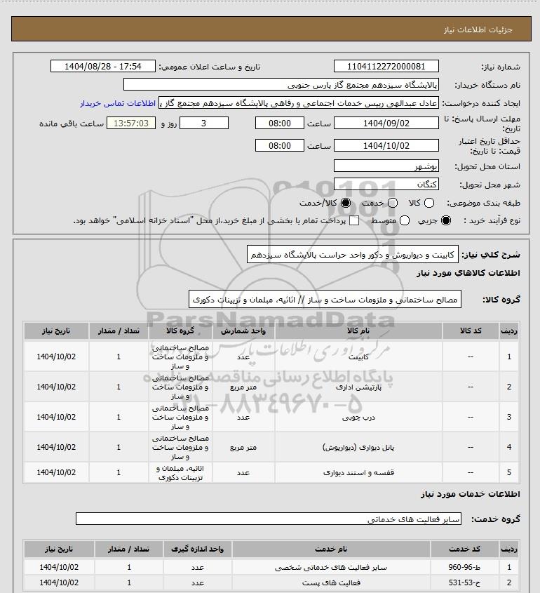 تلفن:5- 88349670 (021) فکس: 88349673 (021) Website: www.ParsNamadData.com E-mail: Info@ParsNamadData.com استعلام کابینت و دیوارپوش و دکور واحد حراست پالایشگاه سیزدهم