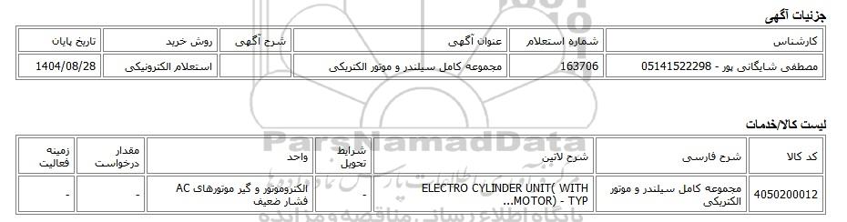 عنوان آگهی: استعلام الکترونیکی مجموعه کامل سیلندر و موتور الکتریکی