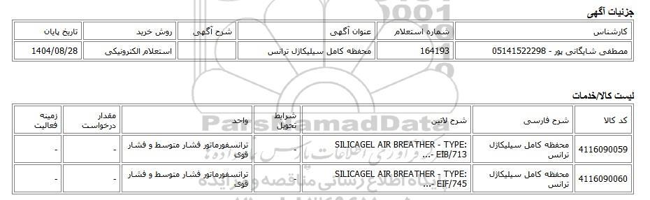 مصطفی شایگانی پور - 05141522298164193محفظه کامل سیلیکاژل ترانساستعلام الکترونیکی1404/08/28