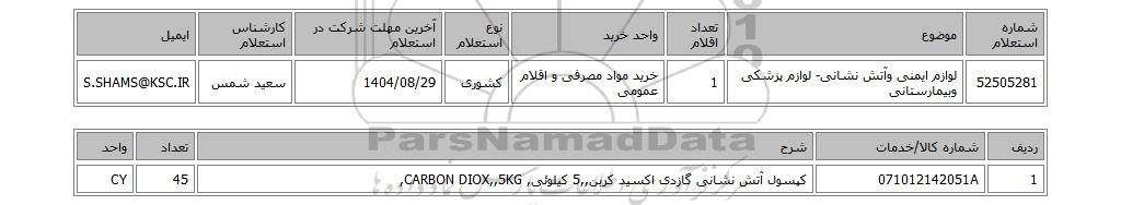 تلفن:5- 88349670 (021) فکس: 88349673 (021) Website: www.ParsNamadData.com E-mail: Info@ParsNamadData.com استعلام لوازم ایمنی وآتش نشانی- لوازم پزشکی وبیمارستانی