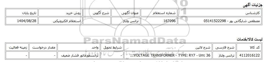 تلفن:5- 88349670 (021) فکس: 88349673 (021) Website: www.ParsNamadData.com E-mail: Info@ParsNamadData.com استعلام الکترونیکی ترانس ولتاژ