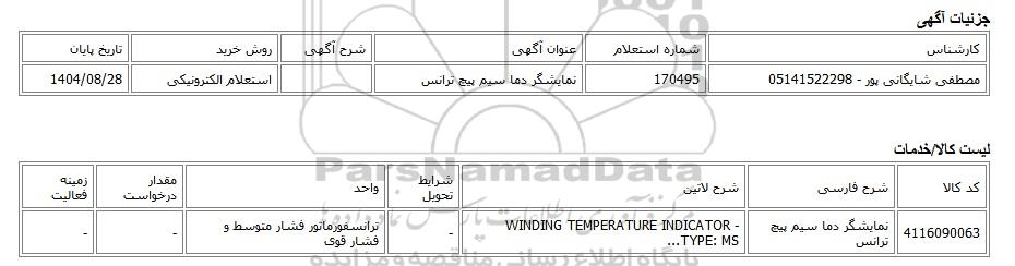 عنوان آگهی: استعلام الکترونیکی نمایشگر دما سیم پیچ ترانس
