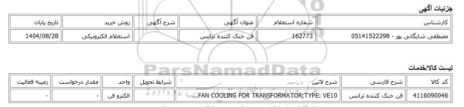 مصطفی شایگانی پور - 05141522298162773فن خنک کننده ترانساستعلام الکترونیکی1404/08/28