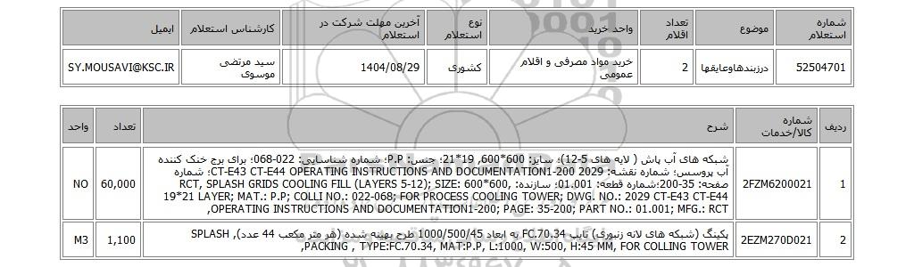 | شماره استعلام | موضوع | تعداد اقلام | واحد خرید | نوع استعلام | آخرین مهلت شرکت در استعلام | کارشناس استعلام | ایمیل | | 52504701 | درزبندهاوعایقها | 2 | خرید مواد مصرفی و اقلام عمومی | کشوری | 1404/08/29 | سید مرتضی موسوی | SY.MOUSAVI@KSC.IR |