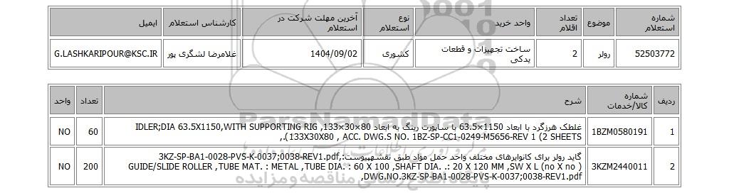 52503772رولر2ساخت تجهیزات و قطعات یدکیکشوری1404/09/02غلامرضا لشگری پورG.LASHKARIPOUR@KSC.IR