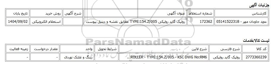 تلفن:5- 88349670 (021) فکس: 88349673 (021) Website: www.ParsNamadData.com E-mail: Info@ParsNamadData.com استعلام الکترونیکی رولیک گاید رولیکی TYPE:154.Z/005 مطابق نقشه و دیتیل پیوست