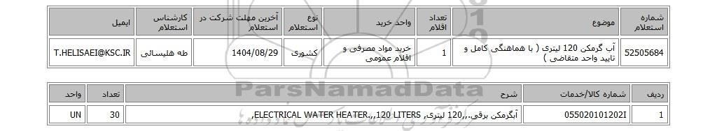 تلفن:5- 88349670 (021) فکس: 88349673 (021) Website: www.ParsNamadData.com E-mail: Info@ParsNamadData.com استعلام آب گرمکن 120 لیتری ( با هماهنگی کامل و تایید واحد متقاضی )