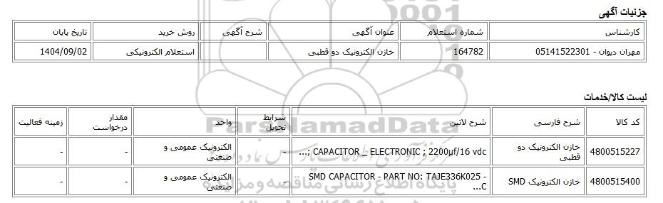 تلفن:5- 88349670 (021) فکس: 88349673 (021) Website: www.ParsNamadData.com E-mail: Info@ParsNamadData.com استعلام الکترونیکی خازن الکترونیک دو قطبی