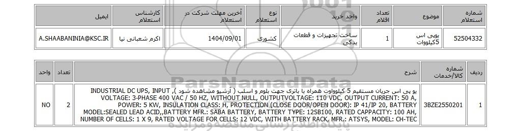 52504332یوپی اس 5کیلووات1ساخت تجهیزات و قطعات یدکیکشوری1404/09/01اکرم شعبانی نیاA.SHAABANINIA@KSC.IR