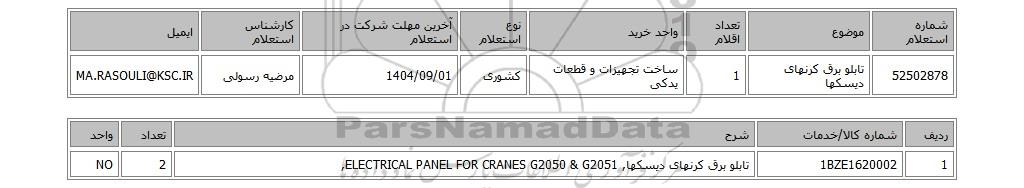 52502878 تابلو برق کرنهای دیسکها 1ساخت تجهیزات و قطعات یدکیکشوری1404/09/01مرضیه رسولیMA.RASOULI@KSC.IR