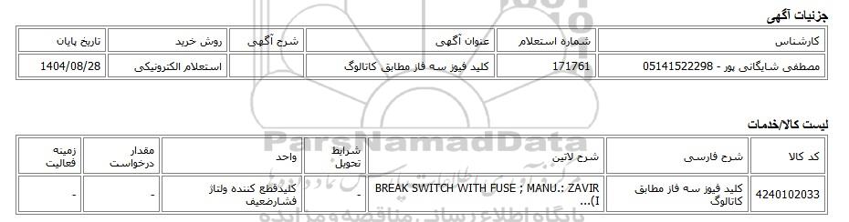 مصطفی شایگانی پور - 05141522298171761کلید فیوز سه فاز مطابق کاتالوگاستعلام الکترونیکی1404/08/28