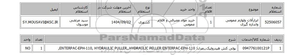 تلفن:5- 88349670 (021) فکس: 88349673 (021) Website: www.ParsNamadData.com E-mail: Info@ParsNamadData.com استعلام ابزارآلات ولوازم عمومی واندازه گیری