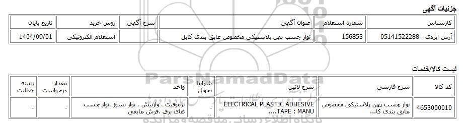 آرش ایزدی - 05141522288156853نوار چسب پهن پلاستیکی مخصوص عایق بندی کابلاستعلام الکترونیکی1404/09/01
