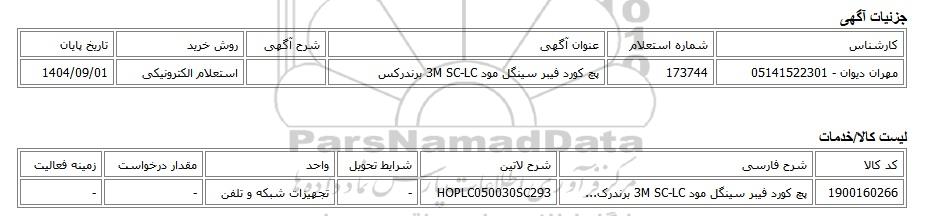 تلفن:5- 88349670 (021) فکس: 88349673 (021) Website: www.ParsNamadData.com E-mail: Info@ParsNamadData.com استعلام الکترونیکی پچ کورد فیبر سینگل مود 3M SC-LC برندرکس