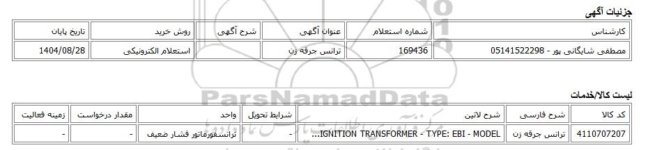 مصطفی شایگانی پور - 05141522298169436ترانس جرقه زناستعلام الکترونیکی1404/08/28